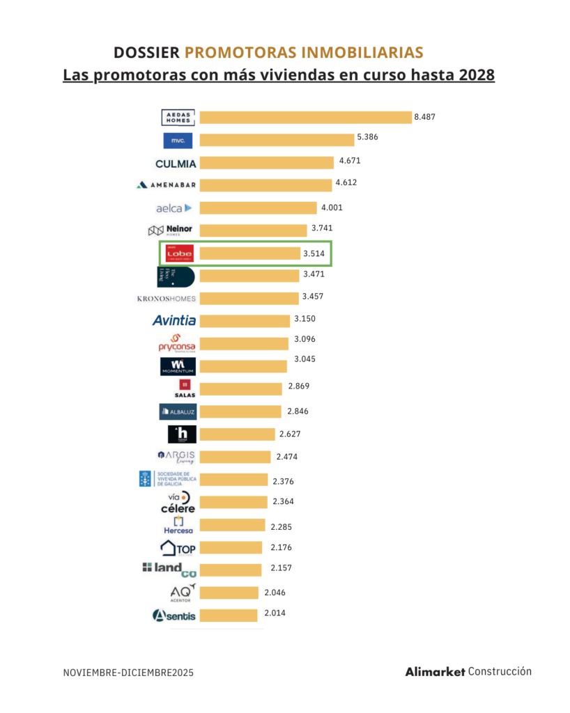 Grupo Lobe se sitúa en el puesto nº7 del ranking nacional de promotoras inmobiliarias, según el Informe Alimarket Construcción 2025, uno de los estudios de referencia del sector. Una posición que consolida a la compañía entre los principales actores que están liderando el desarrollo de vivienda en España en un momento especialmente complejo para el mercado residencial.